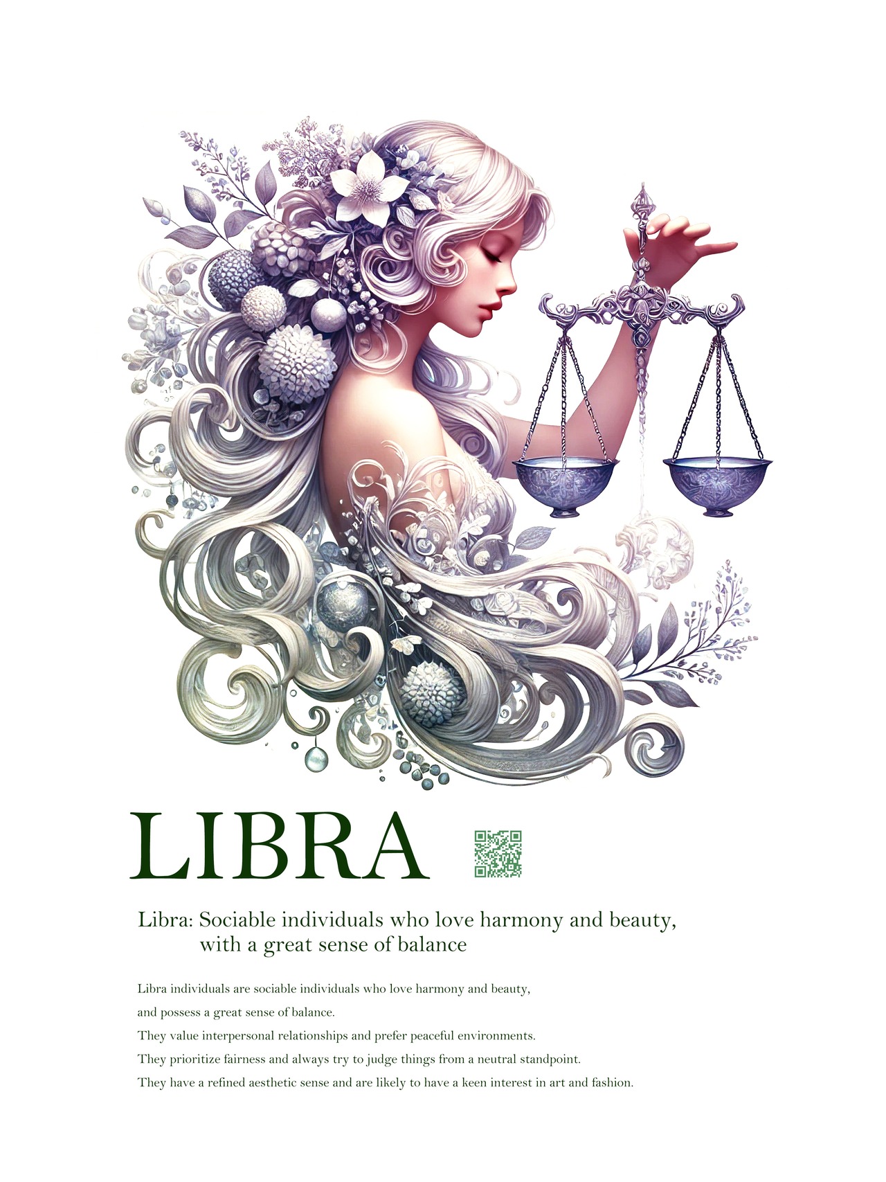 The soft silver and pastel tones highlight Libra’s gentleness and sophistication, creating an elegant and refined impression. Libras value harmony with others while honoring their own aesthetic, and this design visually represents that spirit.