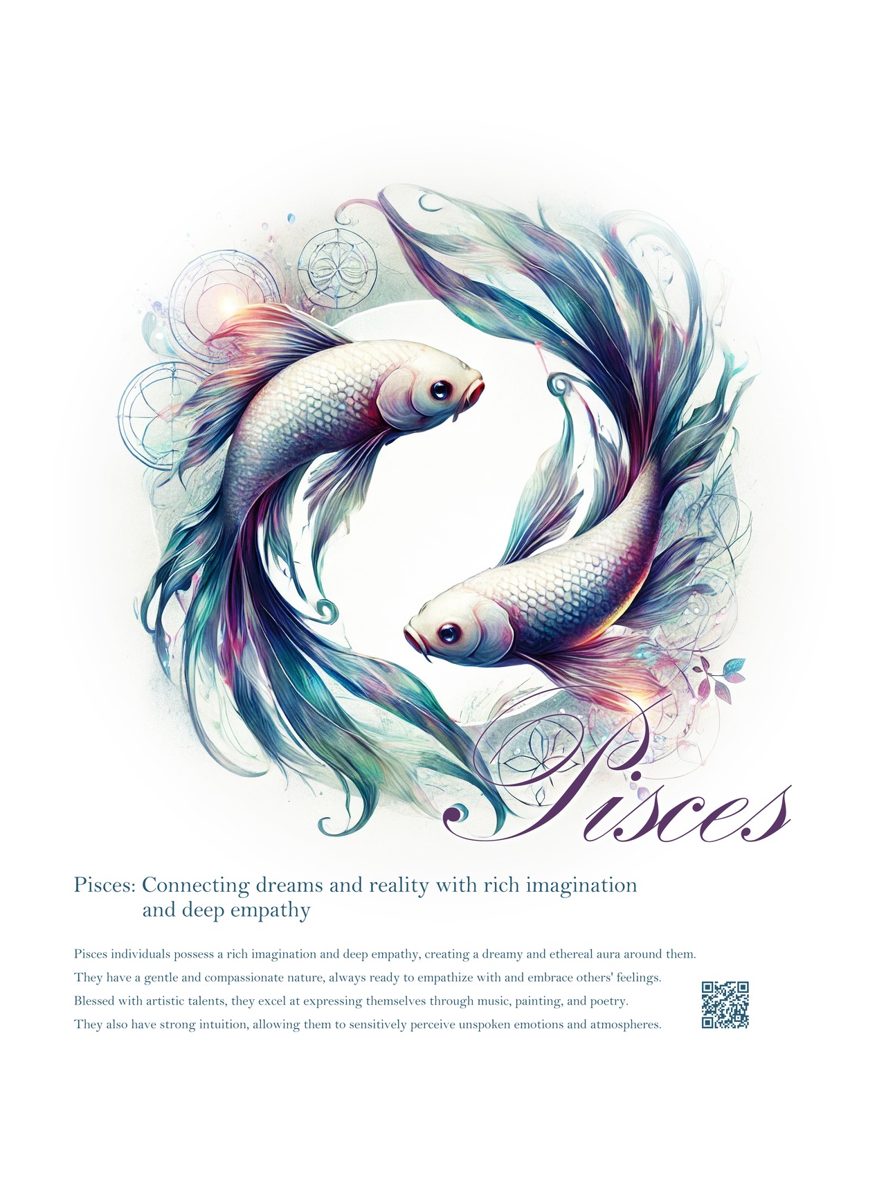 As a water sign, Pisces is known for its adaptability and flexibility. The graceful, flowing movement of the two fish visually portrays Pisces’ natural ability to adapt to different situations. Additionally, the delicate watercolor background enhances the dreamlike world of Pisces, highlighting their boundless imagination and intuitive nature.