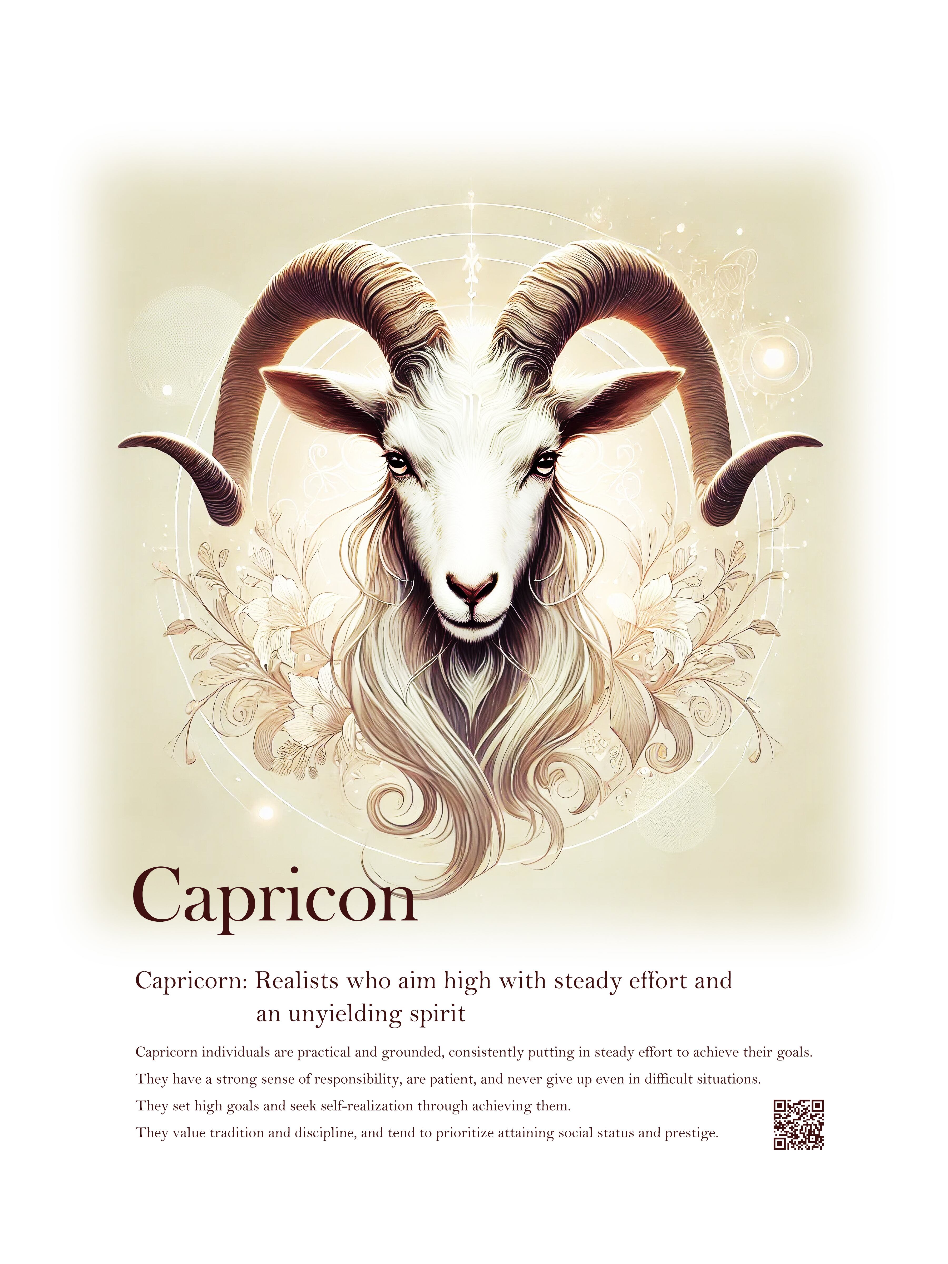 このデザインは、山羊座(Capricorn)の持つ決断力、忍耐強さ、そして目標達成への情熱を表現した一枚です。山羊座は、着実に目標に向かって進み、高い目標を掲げることで知られています。このデザインでは、力強く描かれた山羊の角が、山羊座の持つ不屈の精神と揺るぎない意志を象徴しています。