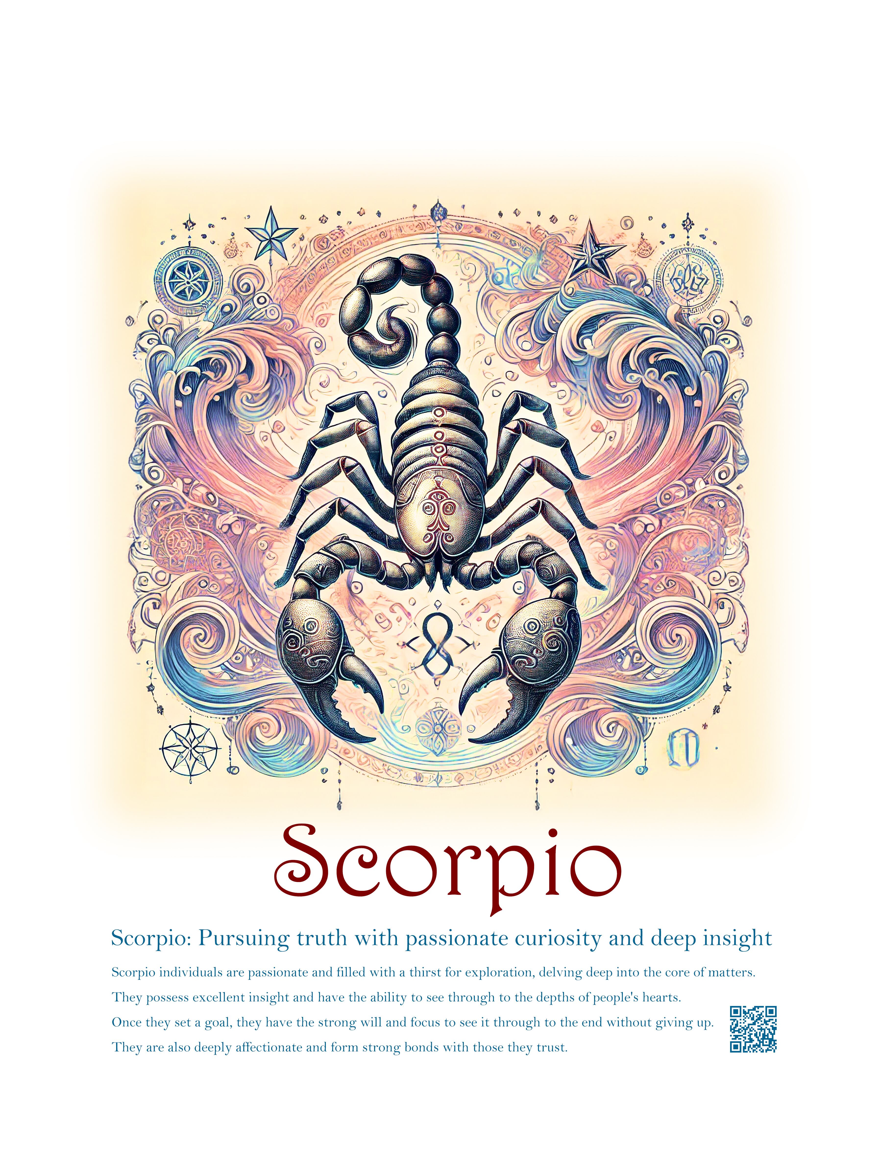 At the center, the powerful image of the scorpion represents Scorpio’s unwavering loyalty and protective nature, symbolizing their readiness to face any challenge to safeguard those they cherish. The background stars and symbols represent Scorpio’s mysterious strength and adaptability, along with their unique capacity for self-renewal and personal growth.