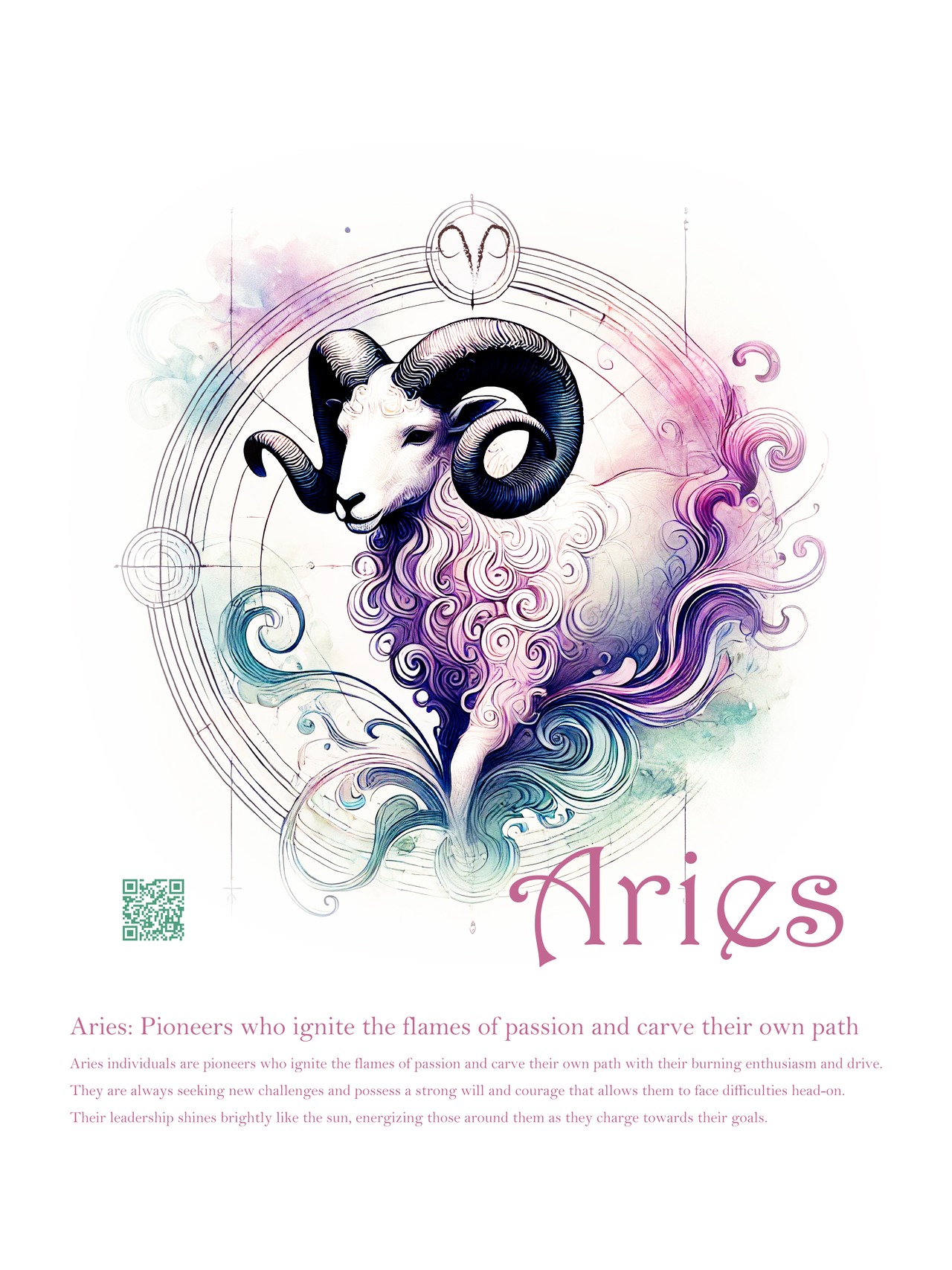 牡羊座は**「始まりの星座」**とも呼ばれ、新しいことに挑戦するリーダーシップと行動力を持っています。このデザインでは、渦巻く曲線とカラフルな色使いが、牡羊座の人々が持つ無限のエネルギーとパワフルな内面を象徴しています。ピンクやパープルの優美な色調は、情熱的な一方で純粋さも感じさせる牡羊座のバランスを描いています。