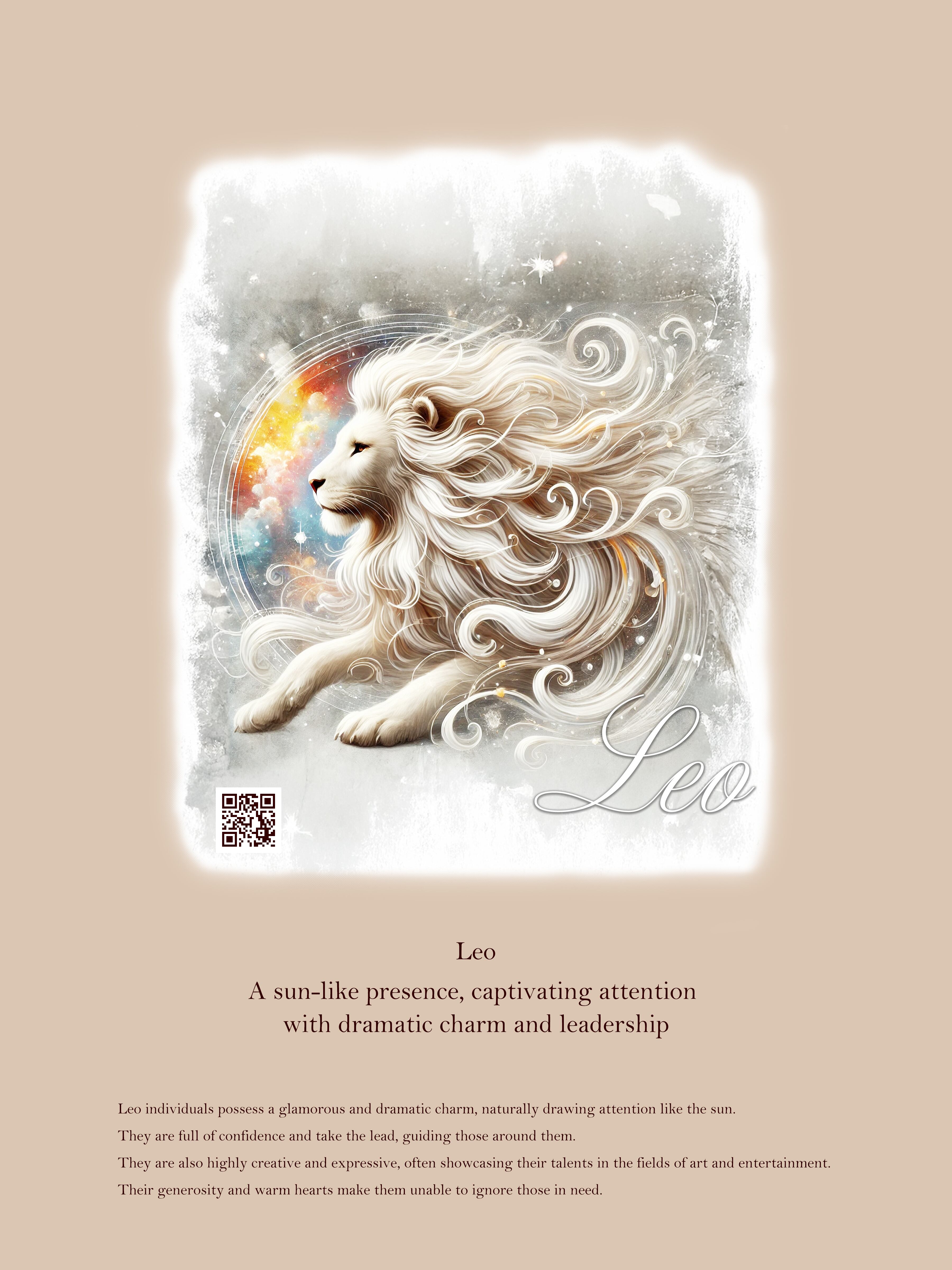 獅子座は、太陽に支配されており、そのエネルギーは周囲にポジティブな影響を与えます。デザインの柔らかな背景とライオンの力強い姿が調和し、獅子座の人々が持つバランスのとれたリーダーシップと優しさを感じさせます。このデザインは、獅子座の持つ内面の光と強さを表現する、まさにシンボリックなアートです。